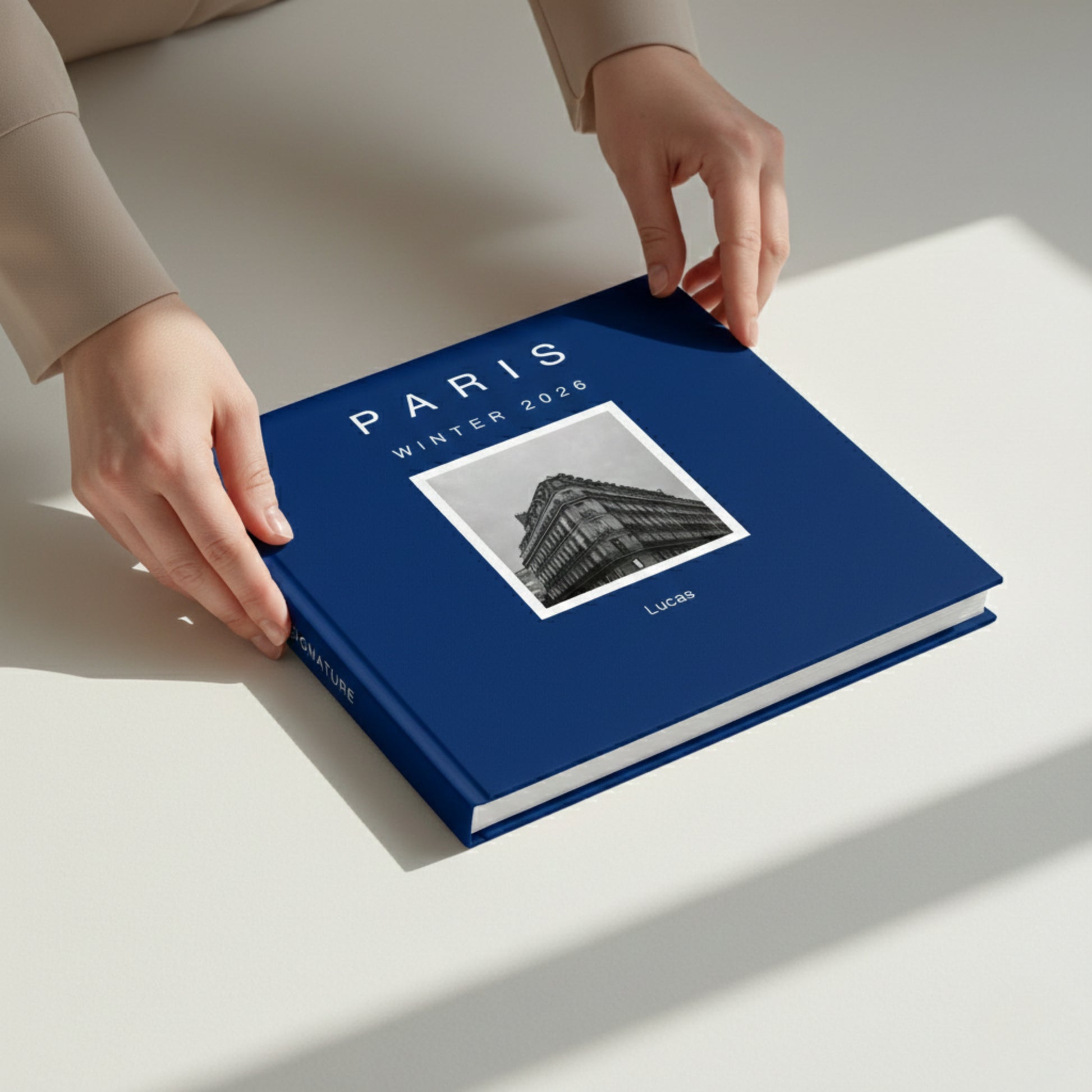 Lumiere Signature es la edición de tapa dura diseñada para viajeros que se mueven con comodidad, estilo sutil e intención. Más que un álbum de fotos, es un archivo personal, un lugar donde los momentos dejan de vivir solo en una pantalla y se convierten en algo que puedes recordar durante años.